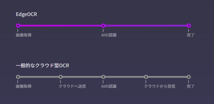 一般的なクラウド型OCRは、クラウドを経由して認識するため、読み取るごとにタイムロスが発生します。一方、EdgeOCRはスマホ上で処理が完結するため、読み取り速度わずか0.1秒の圧倒的な速度を実現することができました。