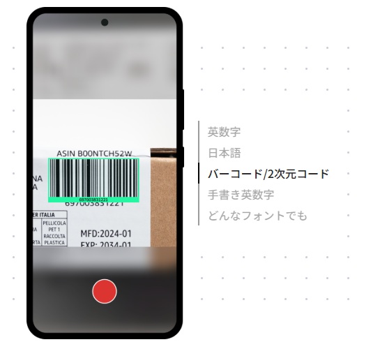 EdgeOCRは、一次元コードも二次元コードも読み取ることができる高性能バーコードスキャナも備えているため、スマホ1つで様々な入力を完結させることができます。